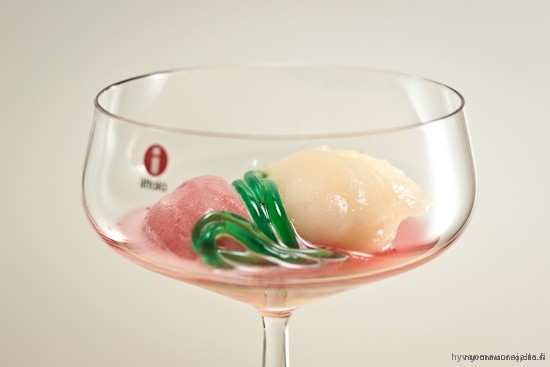 Sorbettia kokeiltiin tehdä kahdella tavalla. Punaisempi pallo tehtiin alginaatilla, joka ihan selkeästi oli väärä aine, tai ei vain osattu. Vaaleampi, joka tehtiin Locuzoon-nimisellä aineella, onnistui paremmin. Locuzoonin tarkoitus on estää isojen jääkiteiden muodostus, ja sitä kautta saada aikaiseksi pehmeämpi koostumus. Sähkövatkaimella teko onnistui aika näppärästi. Jäähdytykseen käytettiin hiilihappojäätä jonka lämpötila on noin -79 astetta. Onnistunut lopputulos on todella hienokiteistä ja kylmää sorbettia.