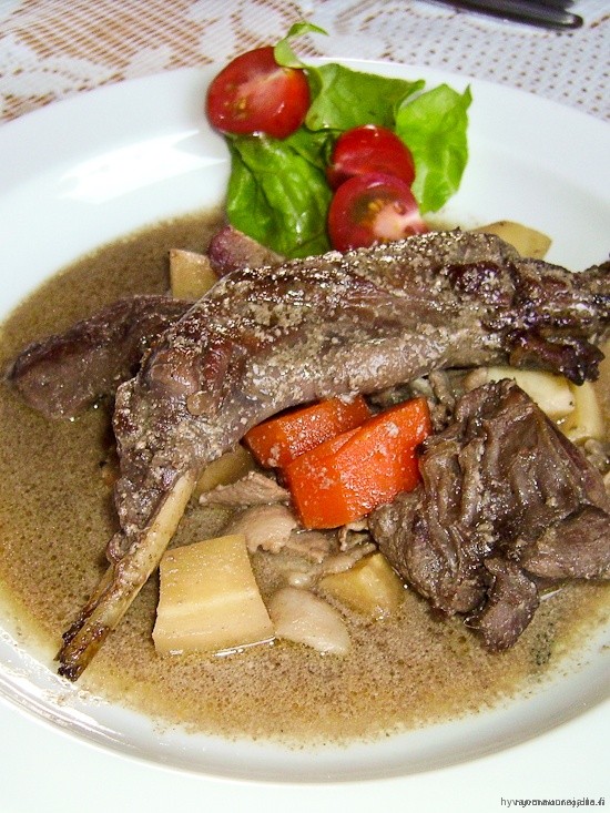 Halutessasi voit erotella liemen ja suurustaa sen kastikkeeksi. Jänispata on erittäin hyvää, jos pitää riistan mausta. Jänis maistuu luontaisesti hyvin paljon maksalle, joten mikäli et pidä maksan mausta, et luultavasti pidä tästäkään. Itse tykästyin valtavasti jänikseen ja kaikki ruokailijat lienevät samaa mieltä sillä ruokailun jälkeen kuului lähinnä voivottelua sohvalta kun itse kukin väitti syöneensä liikaa…