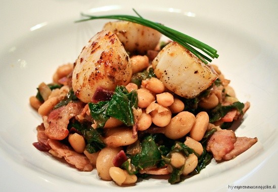 Kampasimpukoita papujen ja pekonin kanssa
