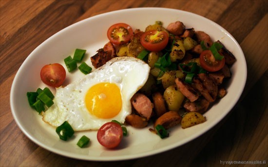 Lopputuloksena oli erittäin hyvä, mutta erilainen pyttipannu. Valmistus onnistuu myös esim. muurinpohjapannulla. Kannattaa ehdottomasti kokeilla.