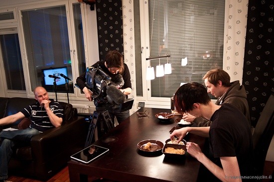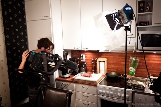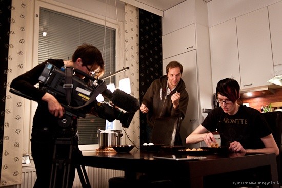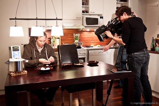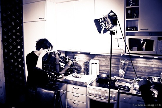 Oli huippumielenkiintoista päästä seuraamaan tällaisen produktion syntyä. Joonas oli tehnyt kuvakäsikirjoituksen etukäteen toimittamani ideoinnin perusteella. Studiovalot asetettiin kohti keittiötä, ja Sini nosti kameran jalustalle. Edettiin duunaamalla ruokia ja kuvaamalla eri työvaiheita. Sini ohjasi toimintaamme kameran takaa, pyytäen toistamaan aina tarvittavia kohtia, jotta saatiin hyvää matskua nauhalle. Lämmöt nousivatkin kämpässä mukavan korkealle uunin, hellan, sirkulaattorin ja valojen loisteessa.
