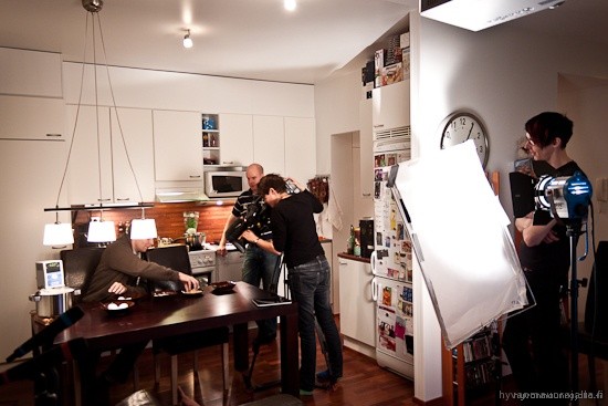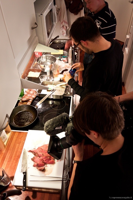 Haastavaa oli pitää keittiötä edes jossain siedettävässä kuvauskunnossa, ja tehtävä osoittautuikin mahdottomaksi. Keittiöni on niin pieni, ettei sinne mahdu normaaliolosuhteissakaan säätämään kuin pari kokkia. Sini hääri TV-kameran ja jalustan kanssa filmaamassa hienoja shotteja kyökissä, eikä sen tielle tokikaan voi mennä. Studiovalot oli asetettu loistamaan parista eri suunnasta, eikä valoakaan passaa blokata. Oli siis paras keitellä vuoroissa ja välilllä pysyä etäämmällä tarkastellen kiehtovaa prosessia valojen ja kameran takaa. Tiskikone tuli täyteen äkkiä, ja loput astiat jäivät lojumaan tiskipöydälle ja minne sattuu. Olisi ehkä pitänyt kiikuttaa niitä makuuhuoneen puolelle, jonne olikin jo roudattu puolet huonekaluista pois tieltä :)
