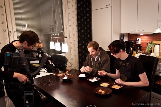 Homma lähti liikkeelle siitä, että Kuningaskuluttaja-ohjelman toimittaja Joonas Turunen otti meihin yhteyttä sähköpostitse. Hän halusi esitellä ohjelmassa molekyylikokkausta ilmiönä ja sen toteuttamista kotikeittiöoloissa. Olimme toki erittäin kiinnostuneita tällaisesta mahdollisuudesta, ja parin kuukauden kuluttua Joonas matkasi vieraaksemme mun tamperelaiseen kotikeittööni kuvaaja Sini Järnströmin kanssa.