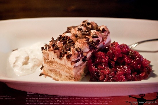 Valitsin tiramisun tulisella karpalo-chipotle -hillokkeella. Tiramisu vaikutti hieman teolliselta, mutta hilloke oli mukavan makuista ja sopivan mietoa. Ja sitä oli paljon.