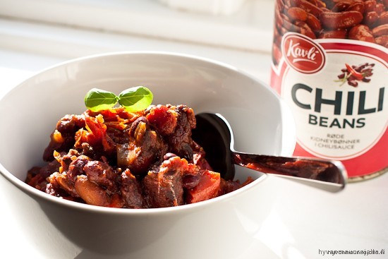 - 1 tölkki (410 g) Rainbow Kidneypapuja chilikastikkeessa (S-Marketista)