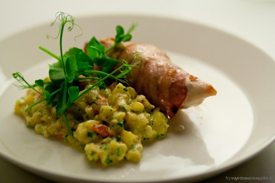 Varma resepti onnistumiselle, ja kenties miehen sydämeen, on valmistaa lihaa käärittynä pekoniin. Nam! Lisukkeena kermaisia talvivihanneksia.