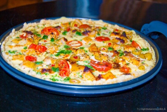 - Pohjan valmistuttua levitä ensin tomaatti tahnaa pohjan päälle ja levittele sitten muu täyte tasaisesti pohjan päälle.