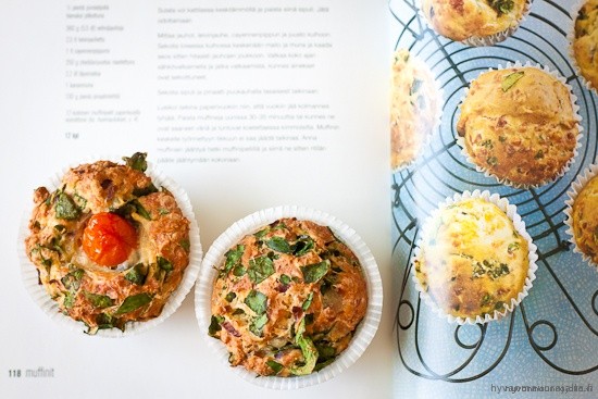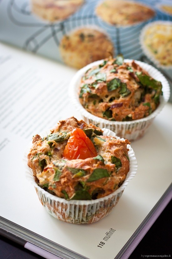 Bongasin Umami-verkkojulkaisusta Tarek Maloufin ja Hummingbird Bakeryn kirjan ”Leivonnaisia herkkusuille — Kuuluisan konditorian reseptit” (The Hummingbird Bakery Cookbook). Se kuulosti niin ihanan houkuttelevalta, että BookPlus sai uuden asiakkaan. Tilasin samalla Michel Rouxin kastikekirjan, mutta siitä lisää myöhemmin. Kirja koostuu pääasiassa cupcake-resepteistä, mutta esittelee myös kakkujen, muffinssien ja muutaman muun pikkuleivonnaisen reseptejä. Aika monta hienoa juttua meni kokeilulistalle. Ensimmäisenä tyhjensin jääkaapista pinaatit näihin kivoihin pikkusuolaisiin.