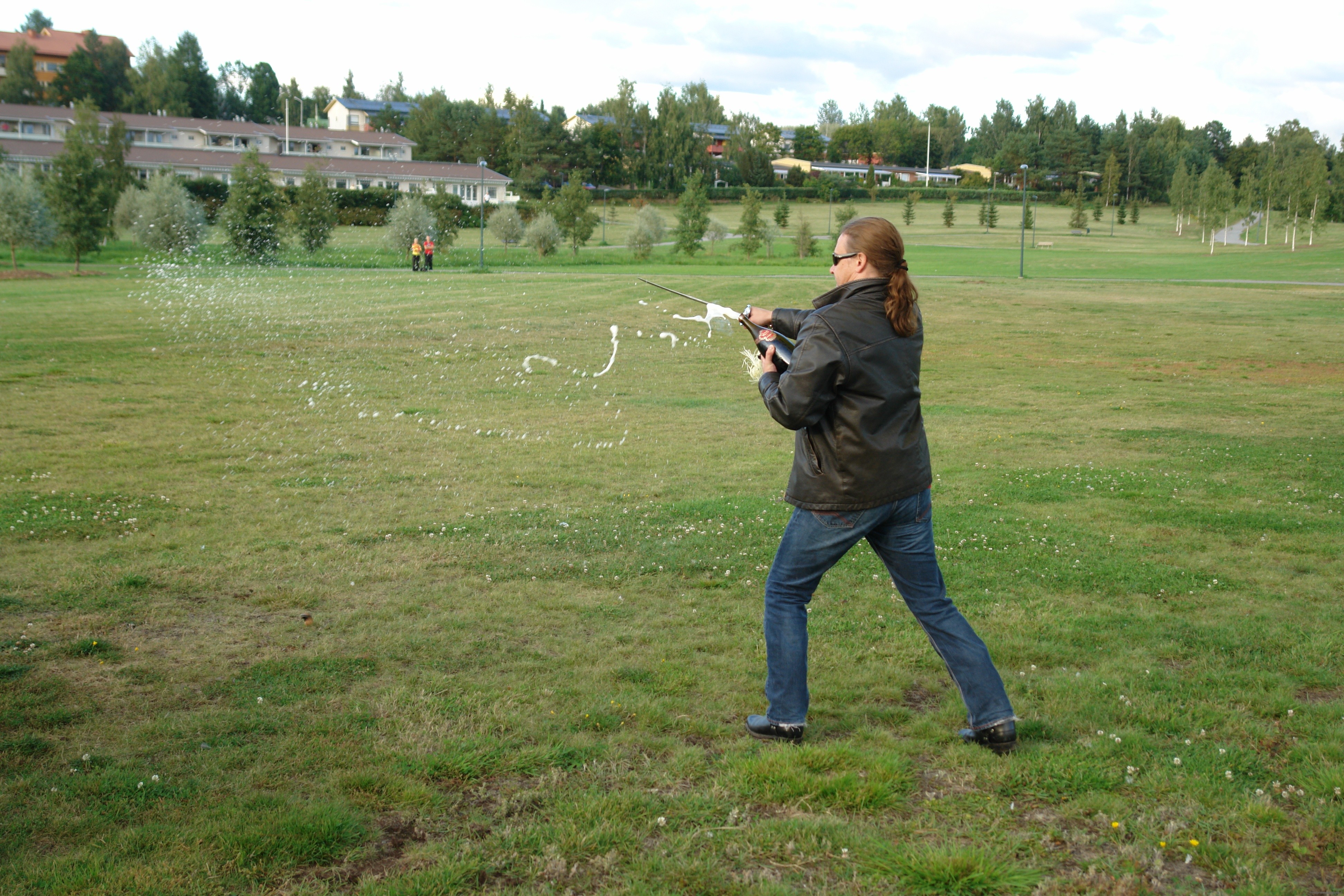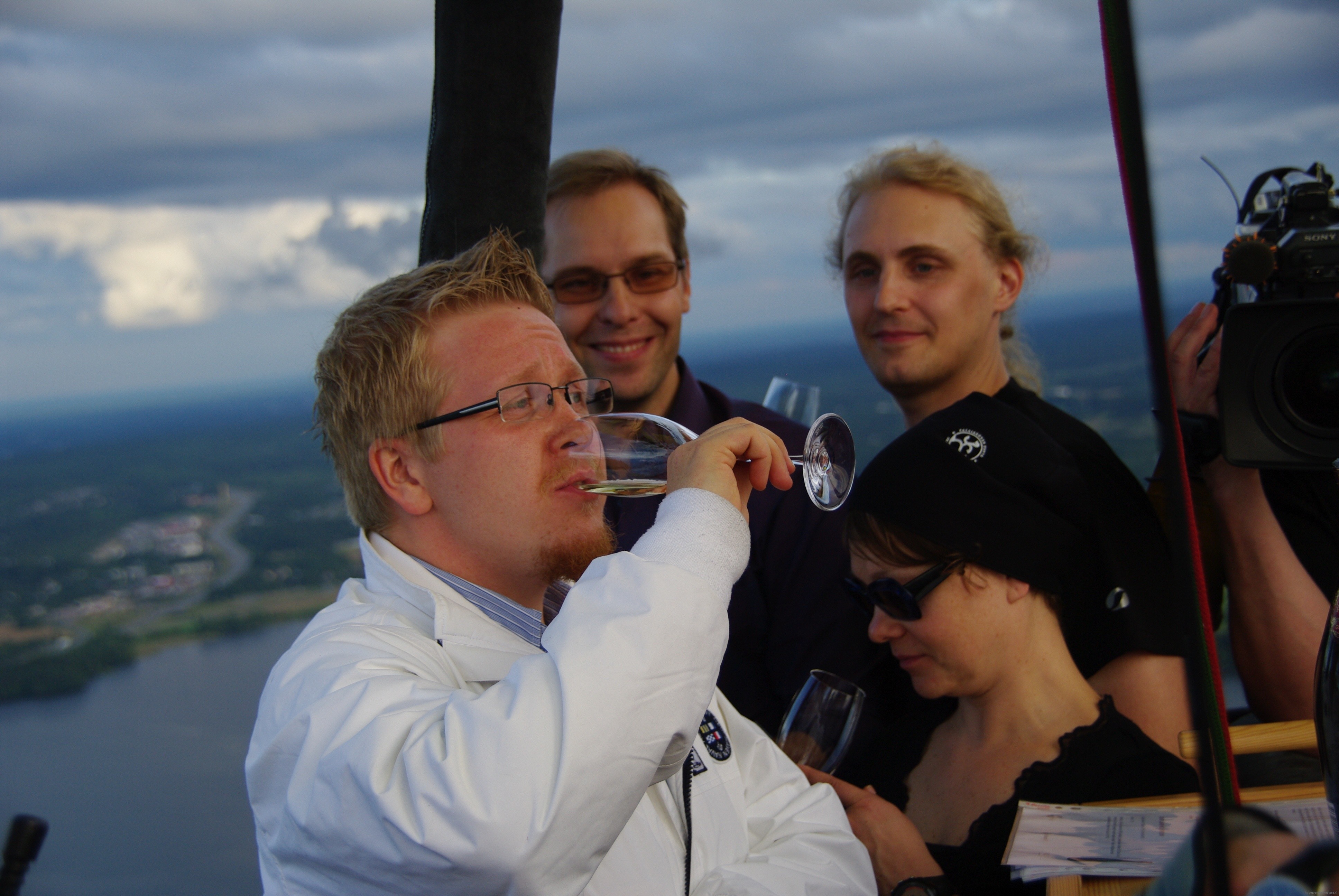 Itse lento lähti noin tunnin valmisteluiden jälkeen Nokialta kello 19.00. Eppu Salminen avasi ensimmäisen samppanjan (Gosset Grande Reserve) tyylikkäästi miekalla, jonka jälkeen nousimme kuumailmapallolla tasaisen rauhallisesti yläilmoihin.
