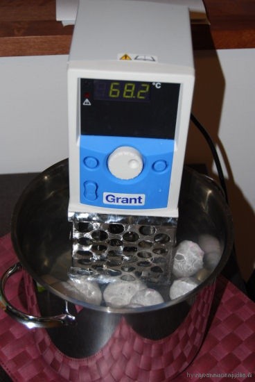 - Kuumenna kananmunat 68 asteen vesihauteessa 1 tunti.