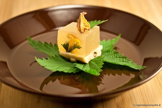 Sami suoritti luonnon voimien uhmaamista sateisena tiistaipäivänä, tuloksena pari litraa suppilovahveroita, litra lampaankääpiä sekä kasa nokkosenlehtiä. Tarkoituksena oli loihtia joko keittoa tai jotain eksoottisempaa. Valitettavasti Mikko ehti jo blogata loistavan suppiskeittonsa, joten päädyimme siihen eksoottisempaan vaihtoehtoon. Valmistimme hyytelön, minkä pohjana toimi Mikon mainion keiton jämät ja päällisenä kasvisliemihyytelö sienillä ja nokkosilla höystettynä. Lisukkeena toimii lampaankäävästä uunissa paistetut sipsit. Vangitsimme siis metsän maut ja olemuksen kuutioon.