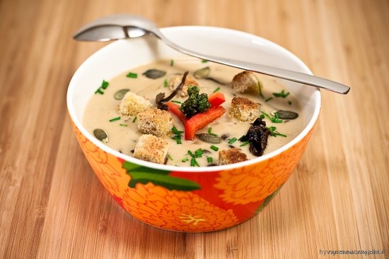 9. Koristele paprikalla, persiljapestolla (persiljaa, kurpitsansiemeniä ja oliiviöljyä blenderissä sekaisin), kurpitsansiemenillä, leipäkrutongeilla ja ruohosipulisilpulla.