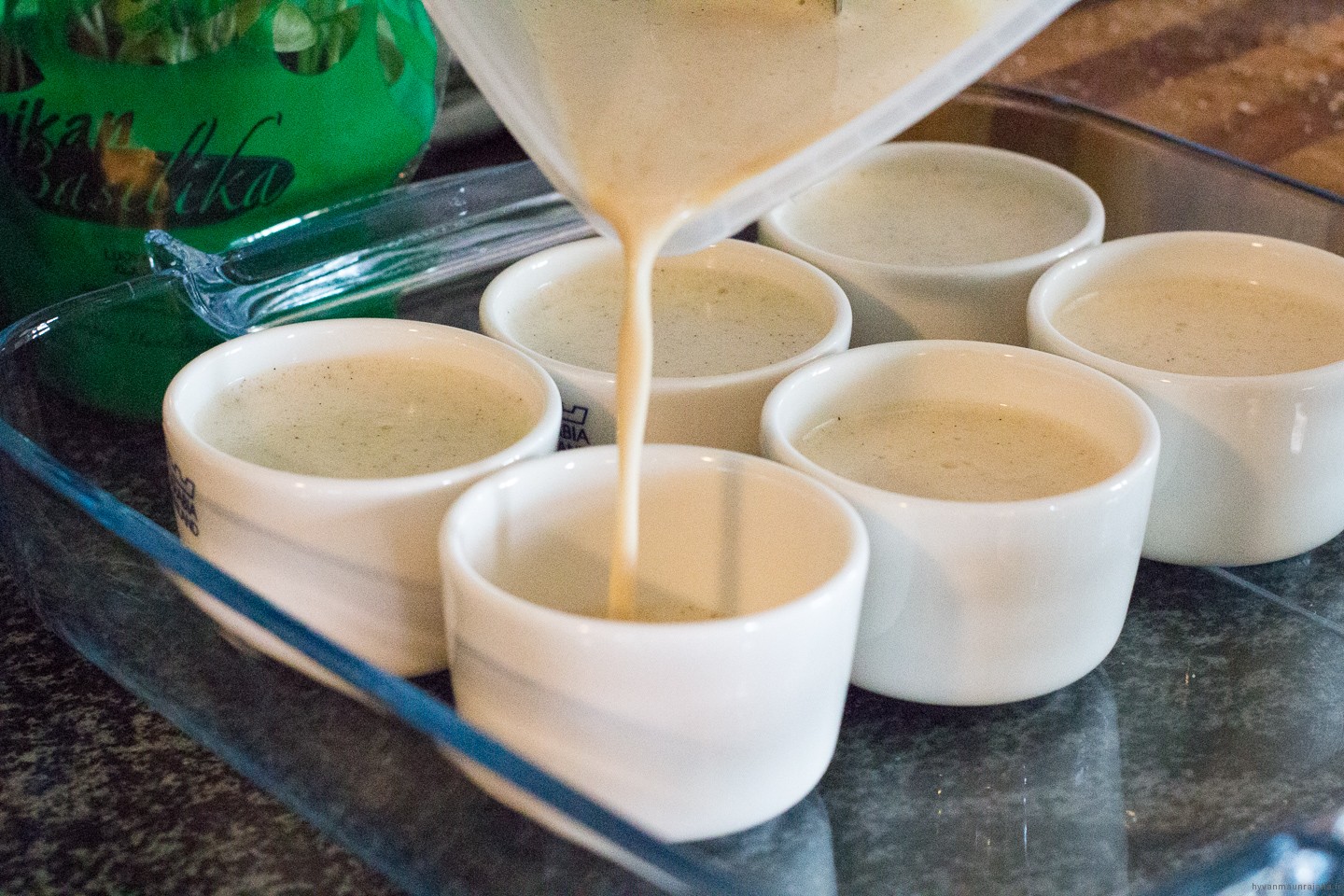 - Nosta vuoka uuniin alatasolle ritilälle ja kaada siihen varovasti kuumaa vettä vedenkeittimestä siten, että vedenpinta olisi samalla tasolla kuin bruleen pinta. Näin annosvuoat kypsyvät vesihauteessa.