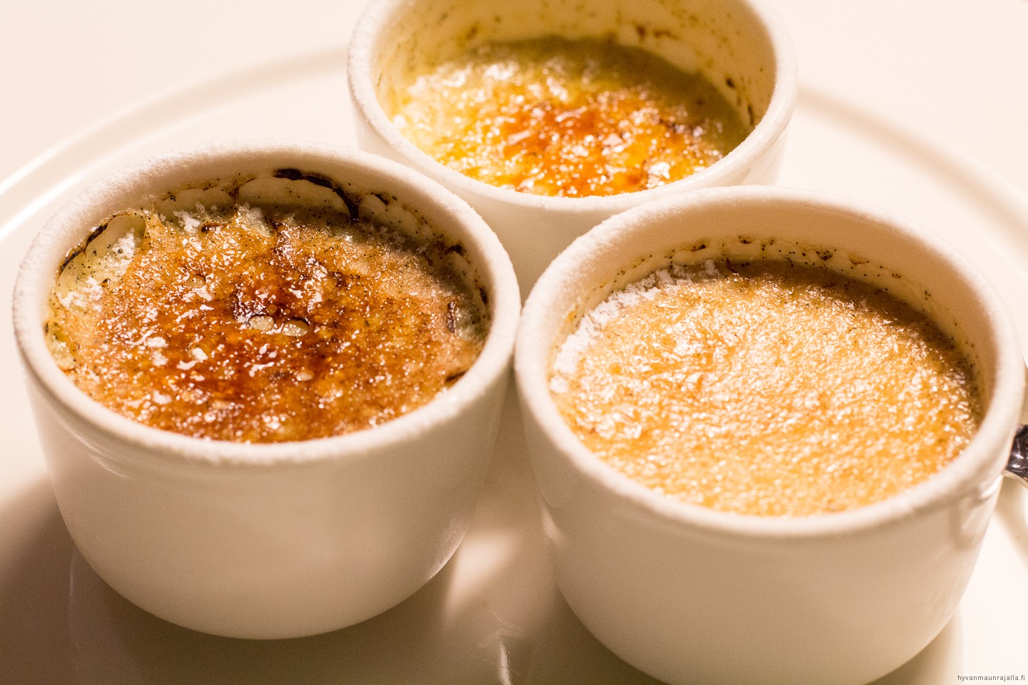 Mitä lukuisampi aksenttimäärä, sitä parempi ruoka? Tampereella Hämeenpuiston Cumulus-hotellin Grillsson-ravintolassa (terveisiä Jussille) oli aikanaan listalla kolmen maun bruleetrio. Tiedä vaikka olisi vieläkin. Näissä oli muistaakseni makuina mansikka, basilika ja vaahtokarkki. Basilika jäi erityisesti mieleen hienona yhdistelmänä.