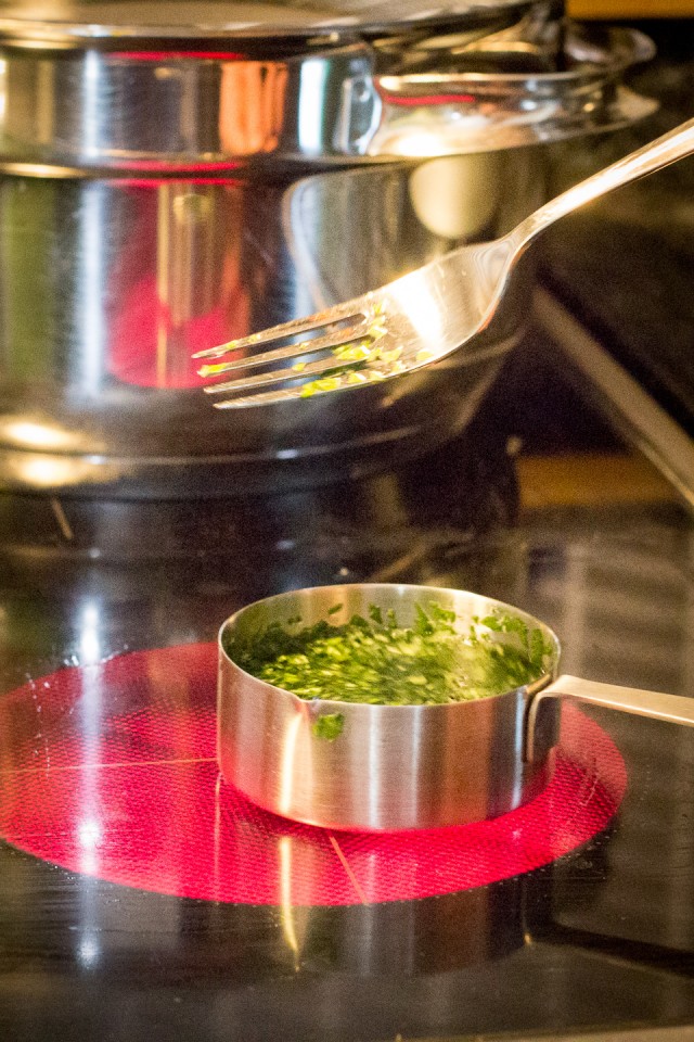 - Sekoita tässä vaiheessa perusmassaan makujuttuja. Meillä tosiaan tehtiin basilikasta veden ja sokerin kanssa makuliemi, salmiakkeja (turkinpippurit) sulatettiin veden kanssa kattilassa ja vahvaa kahvia keitettiin mokkapannulla. Perusmassa jaettiin kolmeen kippoon, ja makuliemiä sekoitettiin pieni määrä jokaiseen erikseen. Makulientä riittää yllättävän pieni määrä, ettei se jyrää yli.