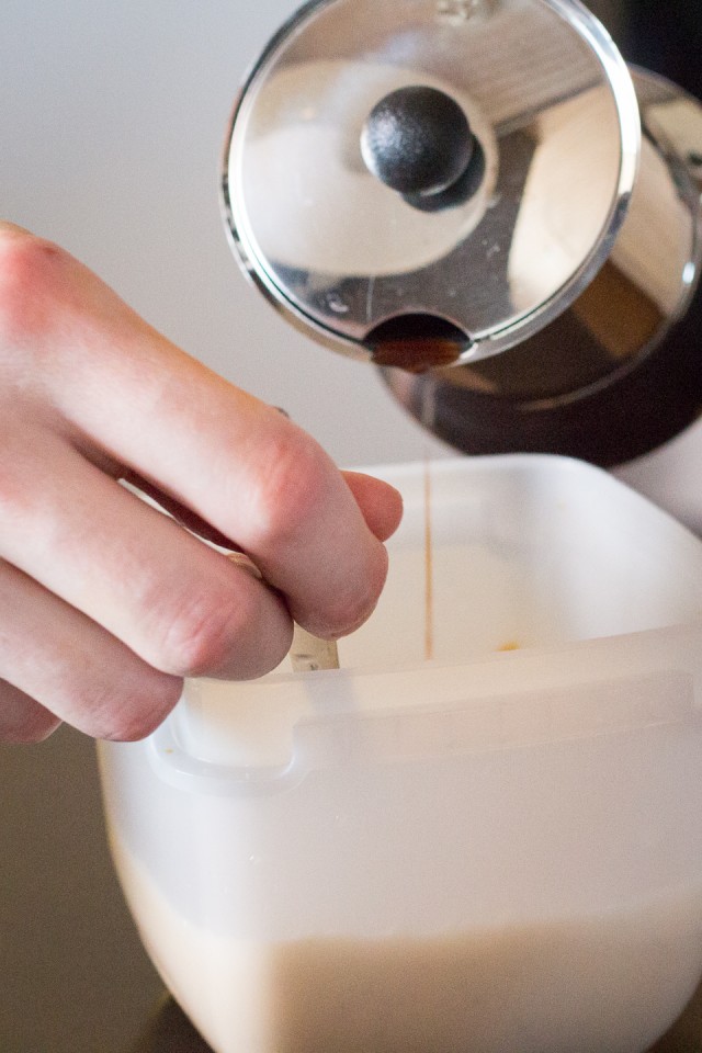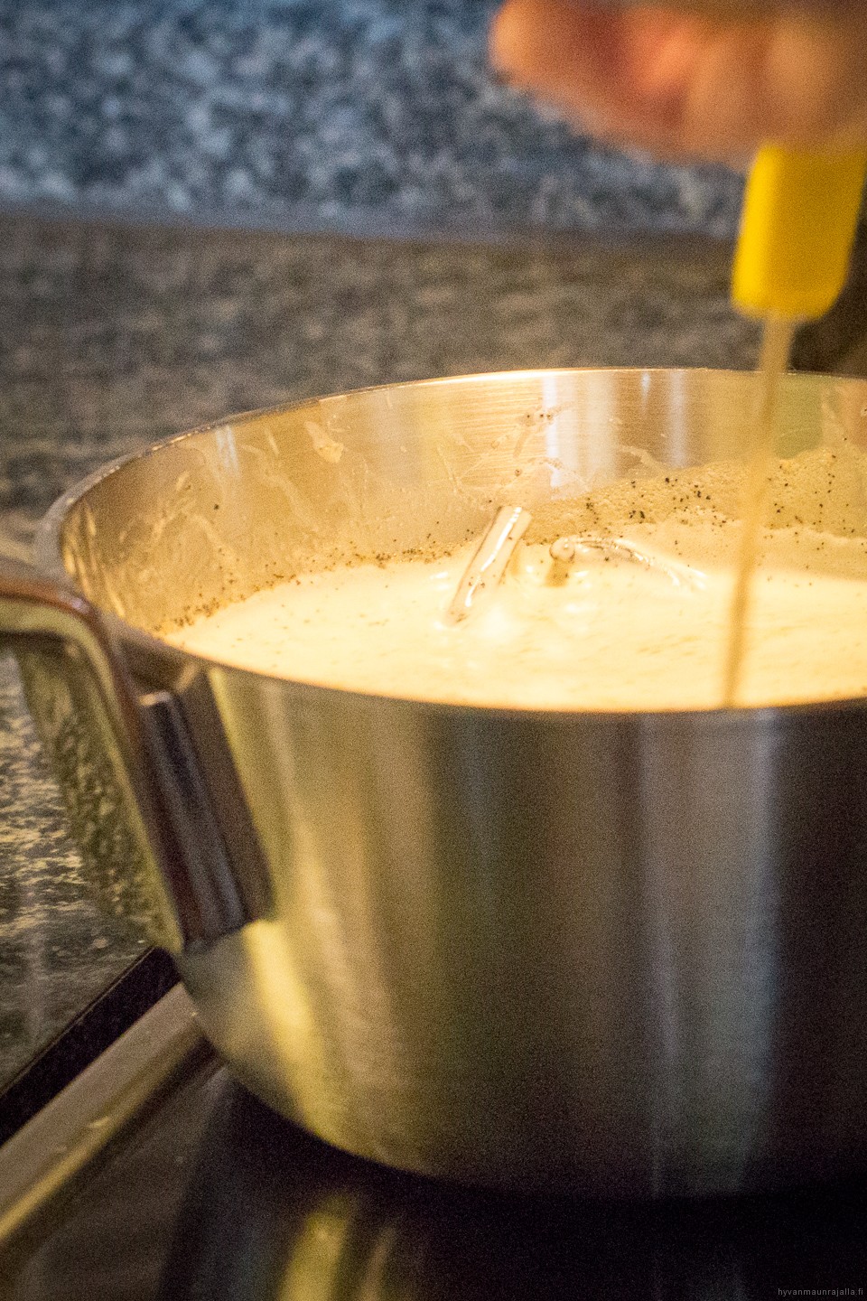 - Halkaise vaniljatanko ja kuumenna se kerman kanssa kiehumispisteeseen.