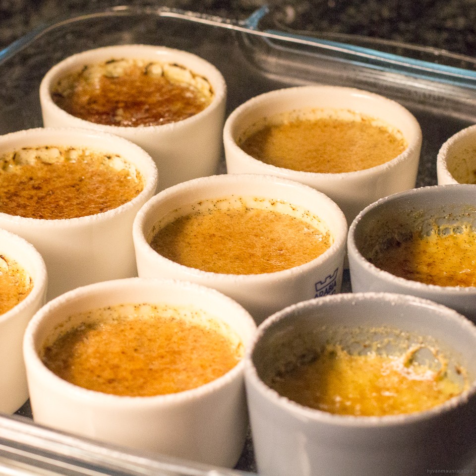 - Kypsennä n. 19-20 minuuttia. Heiluttele vuokaa varovasti hyytymisen arvioimiseksi. Kun bruleet hieman vielä ”twerkkaavat” eli eivät ole kokonaan hyytyneet vaan massa heiluu ja hyllyy vielä, ota pois uunista.