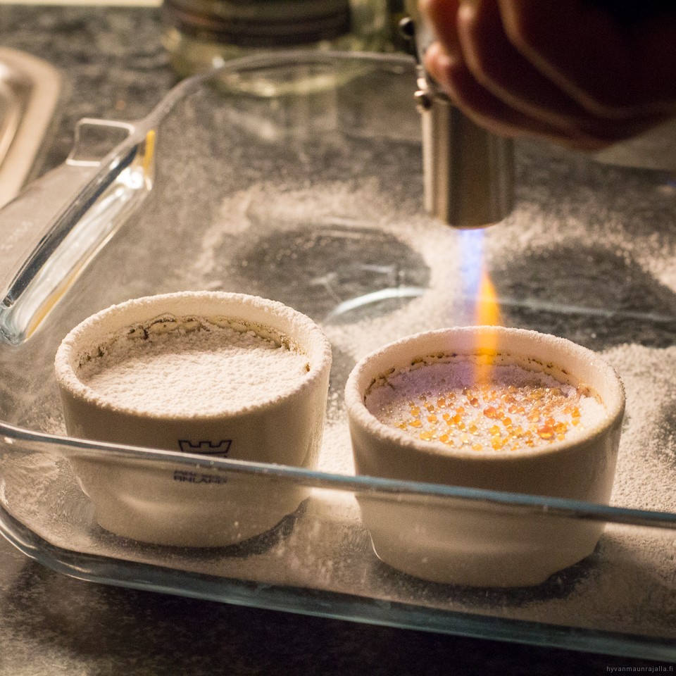- Tarjoilua ennen ripottele runsaasti tomusokeria pinnalle ja paahda tohottimella karamelliksi.