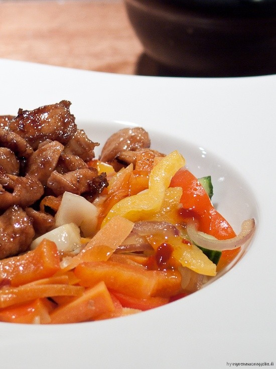 Vihannekset ja kana sopii useasti hyvin yhteen. Tässä tuli kokeiltua wokattuja tuoreita vihanneksia. Kanan paloittelin ja kokeilin kypsentää sitä reilussa määrässä voita ja sokeria, eli tavallaan glaseerata. Tämä yritys ei oikein onnistunut, koska kanoista tuli vähän kuivia, mutta selkeesti tässä on jotain mitä kannattaa kehittää. Pitää ehkä käväistä paikallisesta kiinalaisesta kysymässä kanan paistamiseen vinkkejä.